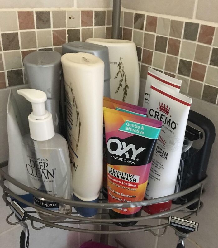 "My Husband's "Bottle Graveyard". Only 4 Bottles On His Shelf Actually Have Soap In Them"