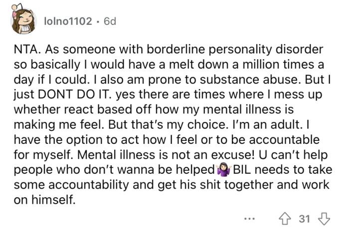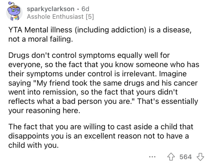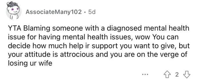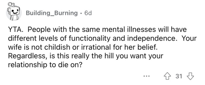 Mental illness stigma can significantly impact how individuals perceive themselves and their loved ones. In this case, the Redditor's comment suggests a lack of understanding of the complexities surrounding mental health issues. Research indicates that stigma can lead to feelings of shame and isolation for those affected by mental illness, often exacerbating their struggles.