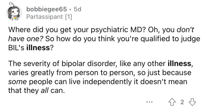 The OP explained that his BIL has bipolar and sometimes has "mental meltdowns" when he doesn't take his medication.