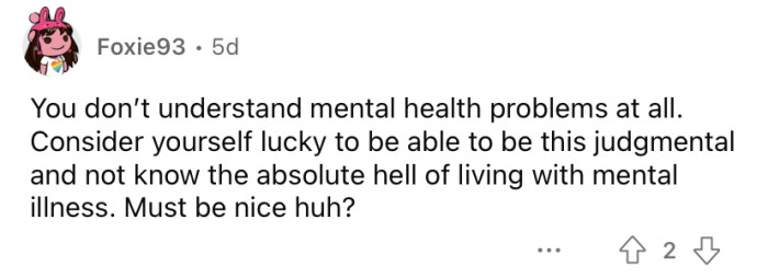 "Consider yourself lucky to be able to be this judgmental and not know the absolute hell of living with mental illness."