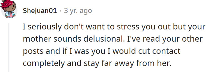 Redditors told the OP that her mother sounds like a mentally unstable person. They advised her to cut her off completely and even take legal action if necessary.