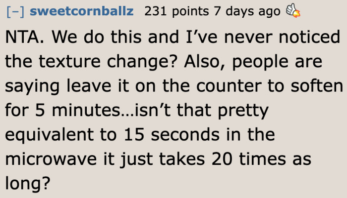 RedditThe original poster (OP) hates waiting for ice cream to thaw naturally. That's why she used a microwave.