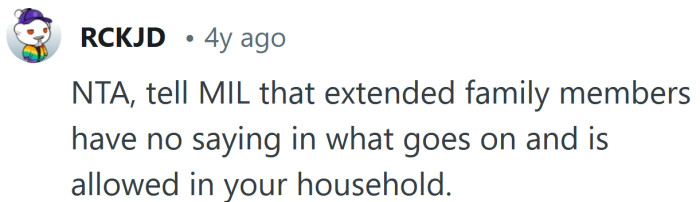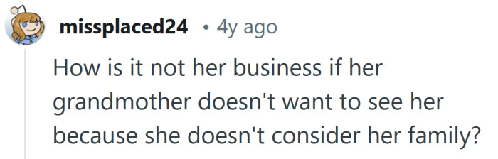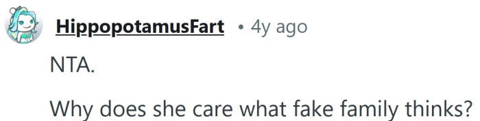 MIL is kind of an odd woman and has some quirky beliefs. One thing she feels very strongly about is when her son married he became extended family vs “real family” As a result she doesn’t make much effort and hardly knows her grandkids.According to her her only real family is her husband. MIL made up a rule when my husband was 17 and dating me that he could never bring a partner to Christmas. Christmas was only for real family and MIL was totally aware that meant she would never spend another Christmas with her son again.She loves December and we don’t even usually see her during the month. It’s been going on since then and for 13 years of marriage and I find it bizarre but she is who she is. Recently we had dinner with mil and my kids. We do this about twice a year and it is the only time she sees them.One questioned why we’ve never spent a holiday with my husbands side and I explained MILs rule. My 13 year old loves reddit and probably reads it a bit too much and called MIL a narcissist and a JustNoMIL (lol we read that sub together, she has good taste) MIL got annoyed and said my daughter is entitled and MiL doesn’t owe us Christmas and wants to spend it with her only real family. That was that but after dinner mil told my husband that we were rude for bit reprimanding our daughter and she needs to learn to shut up when it isn’t her business.Here's how the Reddit community reacted.