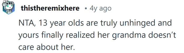 The teen casually labeled her grandmother a narcissist and a “JustNoMIL,” referencing a subreddit she apparently knows well. The mother-in-law was not amused and immediately pushed back.