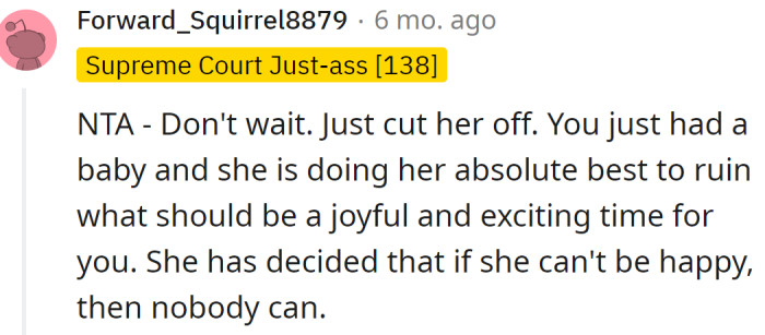 He even warned his mother that they would cut her off if she continued to interfere. However, the MIL's angry messages make the OP wonder if she was in the wrong.