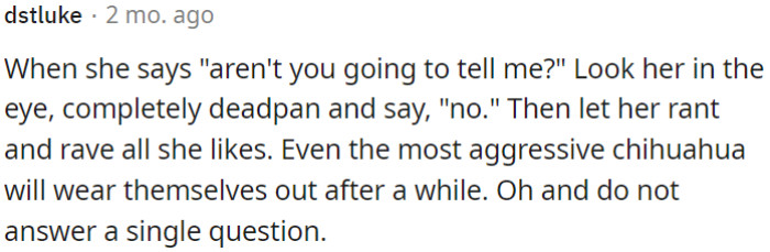 So, OP and her husband faced a big decision. Should they sign for the letter or not? Either way, they knew their weekend was in for a rocky ride. OP's mother-in-law is incredibly nosy, like a little dog that won't drop a bone once she grabs it.