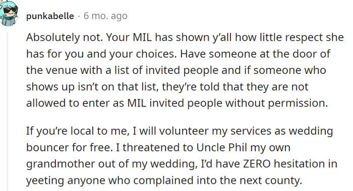 Redditors advised the OP to talk again with her future MIL. However, if that yields no results, they should consider hiring a security guard and providing them with a guest list, so anyone not on the list cannot enter the ceremony.
