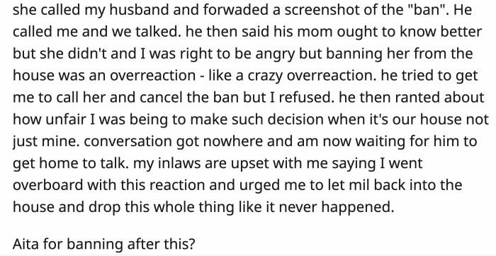 OP's husband tried to get OP to retract the ban and told her it was unfair to ban his mother from their home because it's also his house, not just OP's. However, OP is standing firm on the ban and is refusing to relent despite everyone telling her to just let it slide.