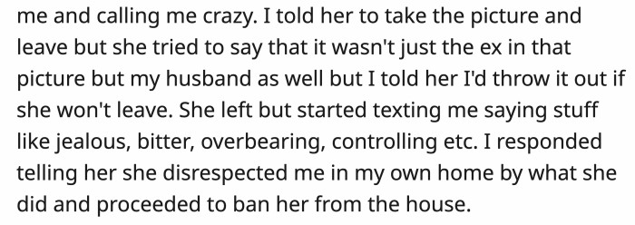 She texted her mother-in-law back, telling her that what she did was disrespectful and that from now on, she was banned from their home. The mother-in-law then called her son and sent him a screenshot of OP's message.