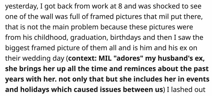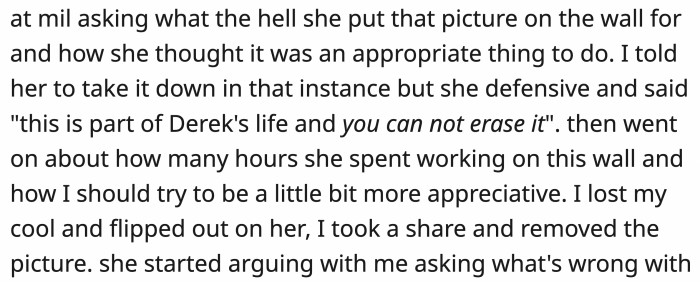 OP understandably became upset with her mother-in-law, asking why she had put that picture on her wall and how it was inappropriate. She told her to take the picture down, but her mother-in-law reasoned that the picture is a part of her son's life and that OP can't erase that.