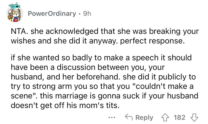 Reddit/Character-Cow2577However, her MIL stood up and began making a speech at the reception, despite being "forbidden" to do so.