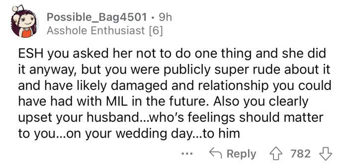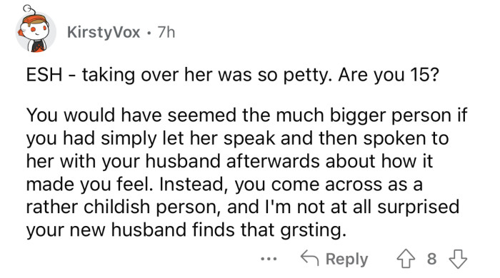 However, when dinner was served, things took a turn for the worse. The OP's MIL stood up and began giving a speech, even though she acknowledged that she was "forbidden" to do so. Family dynamics can often be complex, especially during significant events like weddings. According to Dr. Sarah Johnson, a family psychologist at UCLA, the interplay of emotions and expectations can create tension. The mother-in-law's desire to deliver a 'forbidden' speech likely stems from unmet needs for validation and connection. Research has shown that family members often express their feelings through indirect means, such as speeches, which can sometimes lead to conflict. When a bride interrupts a speech, it may be perceived as a rejection of those familial bonds. Family dynamics play a pivotal role in shaping individual interactions, especially during high-stakes events like weddings. Research published in the Journal of Family Psychology indicates that unresolved familial tensions often resurface in public settings, leading to heightened emotional responses. In this case, the bride's actions could be seen as a reaction to perceived threats from her mother-in-law's speech, which may have been interpreted as an attempt to undermine her autonomy. Weddings often serve as a stage for deep-seated family dynamics to play out, according to Dr. Sarah Mitchell, a family therapist at the University of Michigan. The pressures surrounding these events can lead to heightened emotions and conflict, particularly when expectations clash. This situation illustrates how familial roles can be reinforced or challenged in public settings, leading to conflict when someone feels their role is undermined. Research suggests that navigating these dynamics requires an understanding of each person's individual history and the underlying family system influences. Emotional responses in settings like weddings can trigger deep-seated fears and anxieties. For instance, a study published in the Journal of Family Psychology indicates that events like weddings can amplify feelings of inadequacy or competition among family members. This scenario illustrates how unresolved issues can surface, often leading to a cycle of conflict rather than resolution. In this case, both the bride and her mother-in-law may benefit from exploring these underlying emotions rather than reacting defensively. According to Dr. John Gottman, a renowned relationship researcher, the way couples handle family interactions can significantly impact their marriage's longevity. His studies reveal that conflicts arising from family dynamics often stem from underlying issues of respect and boundaries. It’s crucial for couples to establish clear communication strategies to navigate these complex interactions, especially in emotionally charged environments like weddings. Studies published in the 'Journal of Family Psychology' highlight how family members often experience significant stress during weddings due to conflicting priorities and expectations. For instance, when a bride interrupts a speech that carries emotional weight, it can trigger feelings of betrayal or resentment among family members. These reactions underscore the importance of effective communication and conflict resolution strategies within families, especially during significant life events. Effective communication is crucial in mitigating misunderstandings during high-stress events. Research by Dr. John Gottman highlights that how we express our needs can either strengthen or weaken family bonds. If the mother-in-law felt her speech was vital for family unity, the bride's interruption could be perceived as undermining that goal. To navigate these situations, it's important for family members to articulate their feelings clearly and compassionately. Utilizing 'I' statements can help convey feelings without assigning blame, which may defuse tension and foster understanding. In situations of high emotional intensity, individuals often revert to established coping mechanisms. A study from Harvard University highlights that people facing familial conflict might adopt defensive behaviors as a way to protect their emotional well-being. For the bride, speaking over her mother-in-law could reflect an instinctive need to reclaim her narrative during a moment she perceives as threatening. To address the tensions that arise during weddings, experts recommend setting clear expectations before the event. Couples should discuss and negotiate what is acceptable behavior from family members, as well as how to address potential conflicts. Dr. Anna Lopez, a relationship counselor, emphasizes the importance of pre-wedding discussions to establish boundaries and clarify roles, which can help mitigate misunderstandings during the actual event. To prevent similar conflicts in the future, practicing active listening and empathy can be invaluable. Dr. Brené Brown emphasizes the importance of vulnerability in communication, suggesting that sharing feelings of fear or anxiety can lead to deeper connections. One practical solution involves setting boundaries before the event, where both parties can discuss their expectations and fears. This proactive approach allows for a more harmonious atmosphere during family gatherings, ultimately reinforcing familial bonds. Understanding the psychological principles behind conflict can be beneficial. Cognitive-behavioral therapy (CBT) emphasizes the importance of recognizing and re-evaluating thoughts during interpersonal conflicts, promoting healthier communication patterns. For couples dealing with family stressors, implementing regular check-ins about boundaries and expectations can help mitigate the emotional fallout from these events. Additionally, practicing empathy can go a long way in these situations. Understanding that family members may have their own emotional investments in the wedding can help couples navigate conflicts more gracefully. Encouraging open dialogue about feelings