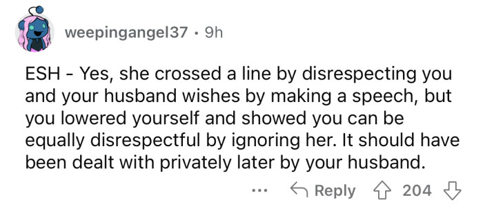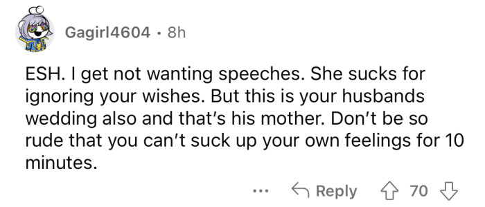 Reddit/Character-Cow2577She explained that she specifically requested there be no speeches at her wedding.