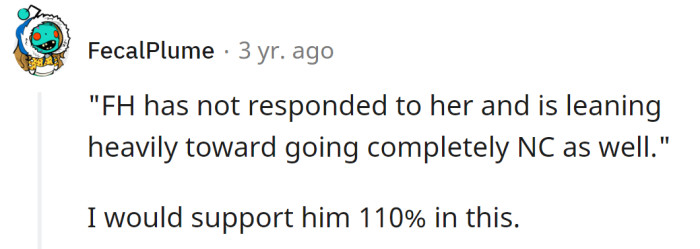 The OP also told her that if she wanted to have a relationship with any future grandchildren, she must manage her problems. The fiancé is also considering cutting ties.