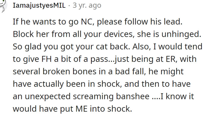 The OP wanted to share how they managed to get their cat home, as well as the drama that ensued. While the couple was at the hospital due to the fiancé's injuries, they texted the MIL to let her know they would go to her house to take the cat.