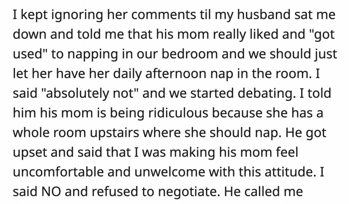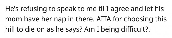 Her husband has since stopped talking to her until OP agrees to let his mom nap in their room. He also said OP is being an a**hole for choosing to die on this hill.