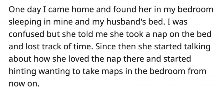 MIL has since begun hinting at how much she loves napping in her son's and his wife's marital bed. She's heavily implying that she wants to nap in their bedroom from then on.