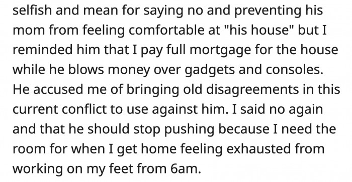 OP reminded him that she pays the full mortgage for their house while he spends his money on gadgets and consoles. He said OP was bringing up past disagreements in this new conflict to use against him.
