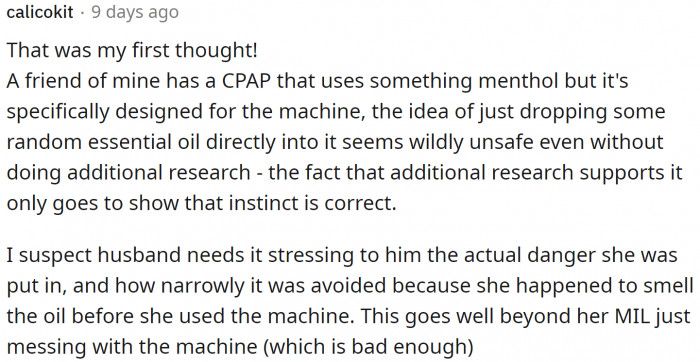 The community was completely on her side. Some Redditors from the medical field even educated her that some essential oils used in a CPAP machine could be harmful or even fatal.