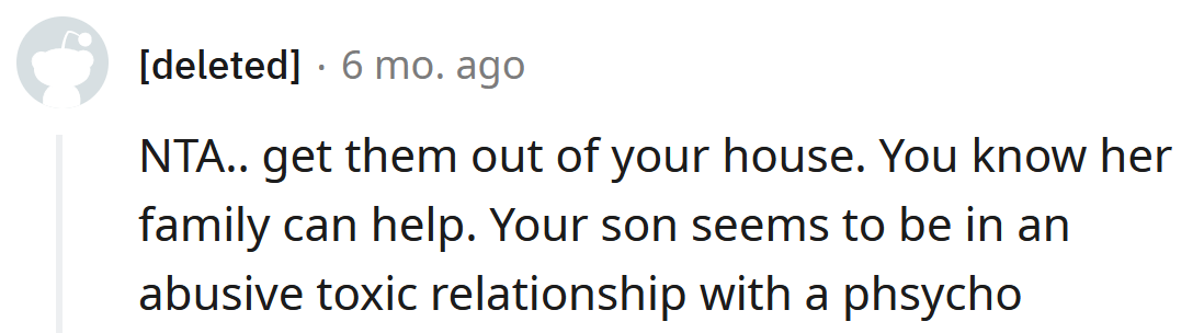 The OP says her son's girlfriend didn't work, and she would sleep all day. Eventually, the Redditor kicked them out of her home.