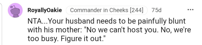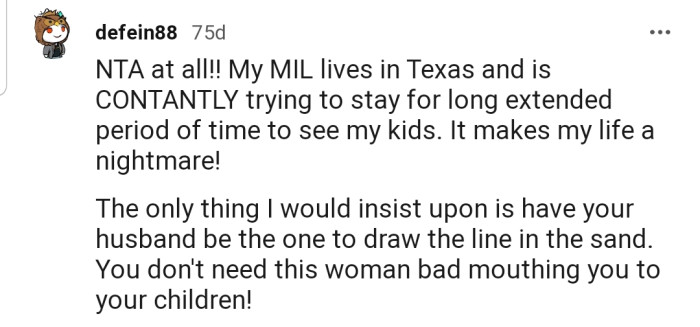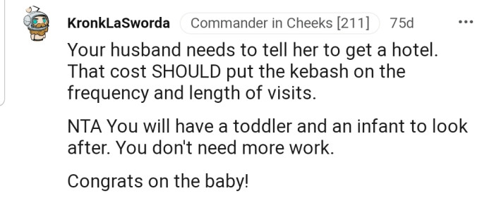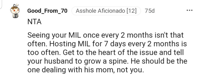 The commenters agree that OP is NTA, but they weren’t so impressed with OP’s husband. According to them, he should be putting his foot down to reduce his mother’s visits or ensure that her visits aren’t causing more harm than good.