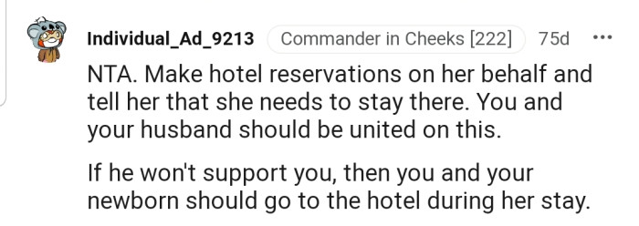OP further shared that they are having a baby very soon, and her mother-in-law again insisted on coming to visit for a week after OP and their husband return from the hospital. To this, OP and their husband suggested she go to a hotel instead of their home. OP’s mother rejected this suggestion.