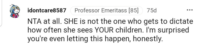 "NTA at all. SHE is not the one who gets to dictate how often she sees YOUR children."