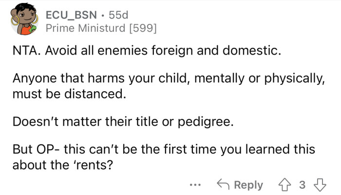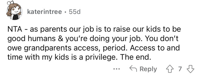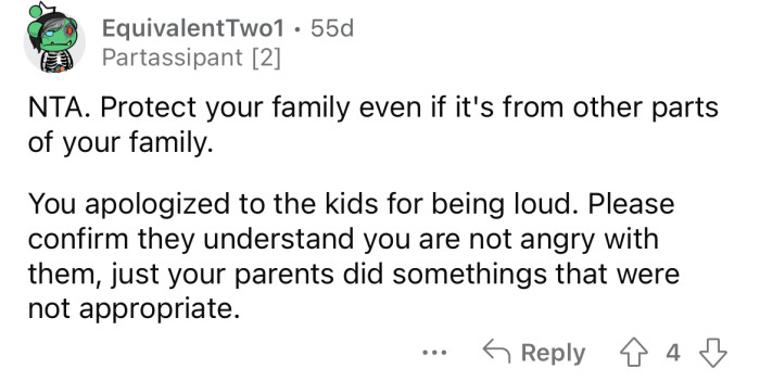 This Redditor's decision to ban their parents from seeing their children is a protective measure grounded in psychological principles of safeguarding the next generation.