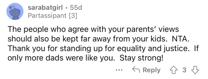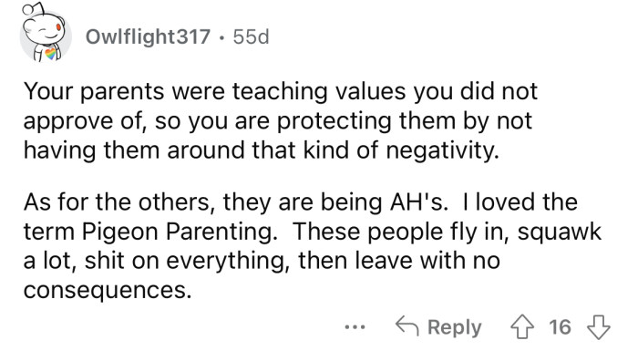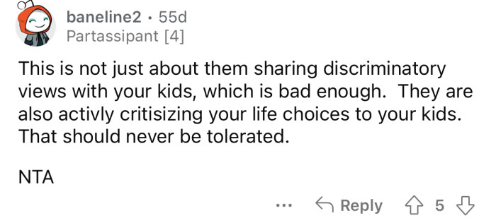 When the OP asked his son about it, he explained that he had heard those things from his grandparents. The Redditor went straight to his parents and confronted them, telling them they would no longer be allowed to spend time with the children if they were going to teach them such hateful things.