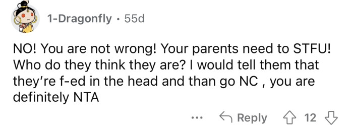 However, the OP's parents told him they didn't think "a man is good for a woman's job" and other equally discriminatory things. Now the Redditor's other family members think he's being unreasonable, so the OP is wondering if he is the a**hole here.