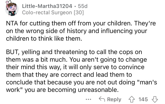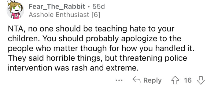 The Redditor went straight to his parents and confronted them, telling them they would no longer be allowed to spend time with the children if they were going to teach them such hateful things.