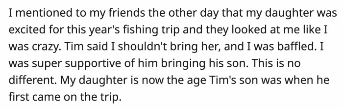 Tim said OP shouldn't bring his daughter, but OP recalled the time he supported Tim in bringing his son on their fishing trips. OP argued that bringing his daughter was no different, as she was the same age Tim's son was when he first went fishing with them.