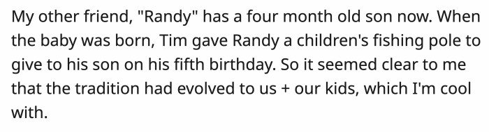 To OP, that meant their tradition was no longer just for them; the gesture indicated it was a fishing trip for them and their kids.