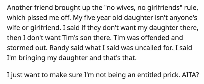 One of their friends recited the "no wives, no girlfriends" rule, which angered OP. He pointed out that his five-year-old daughter was no one's wife or girlfriend.