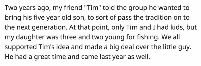 Two years ago, one of OP's friends, Tim, told the group he wanted to bring his five-year-old son on their trip. He said it was a way to pass down their tradition to the next generation.
