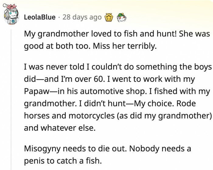 "Misogyny needs to die out. Nobody needs a penis to catch a fish."