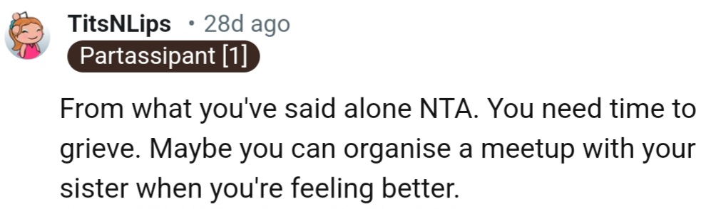 While it was unfortunate that the timing coincided with OP’s sister's birthday party, Redditors felt she wasn't selfish for needing time to mourn.
