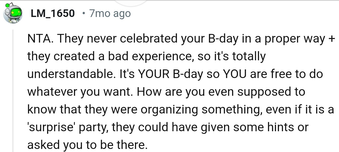 Her stepdad and mom scolded OP for missing their surprise birthday party, but she shot back at them that they never cared about her birthday before, and this left them in shock.