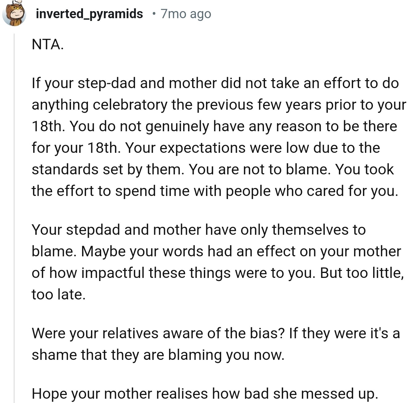 Redditors were with OP on this one. They collectively condemned her mom and stepdad’s behavior.