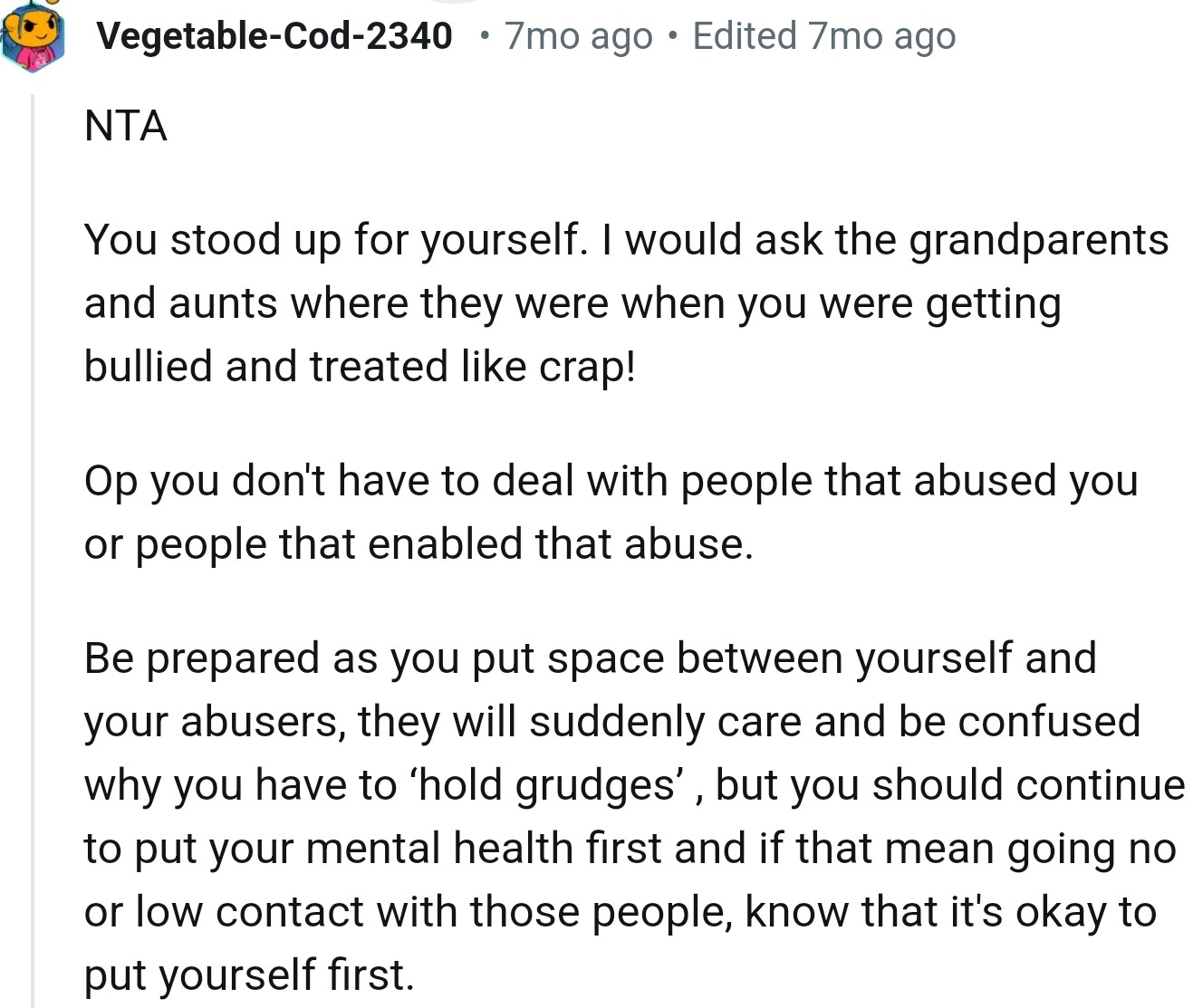 "OP, you don't have to deal with people that abused you or people that enabled that abuse"