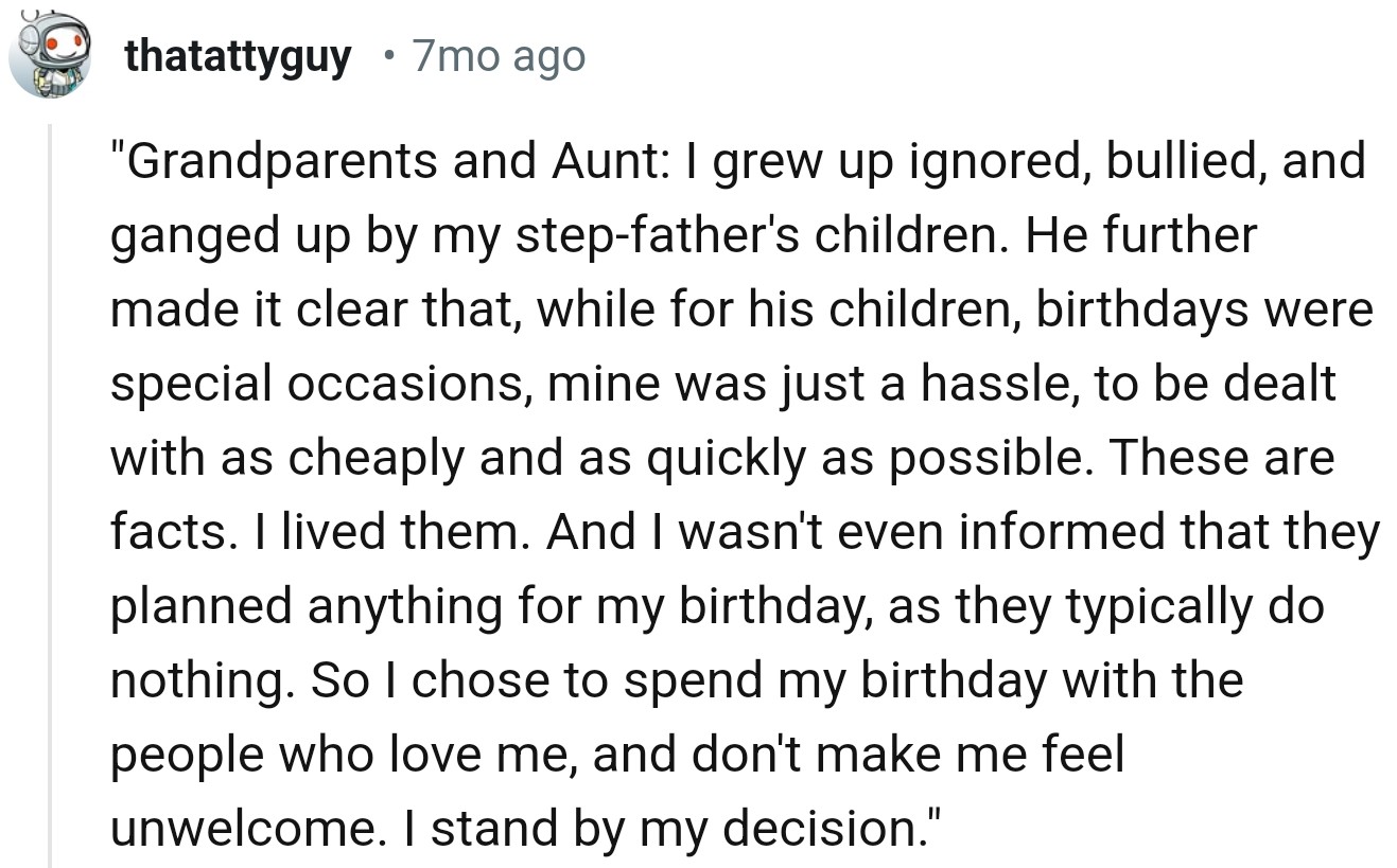Now, let’s talk about birthdays and Christmases. While OP’s step-siblings received lavish gifts, she got the bare minimum—a stark reminder that, in this household, she was second-tier.