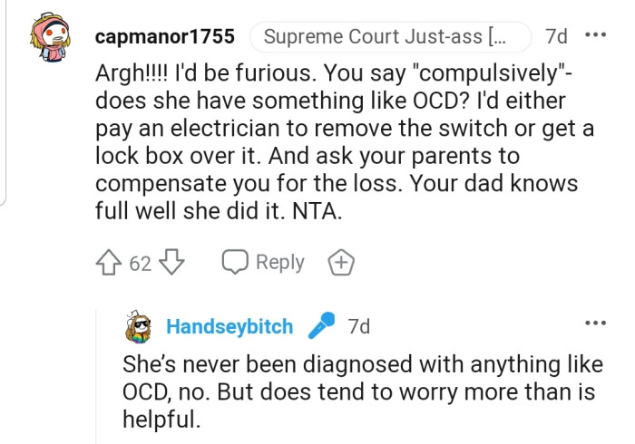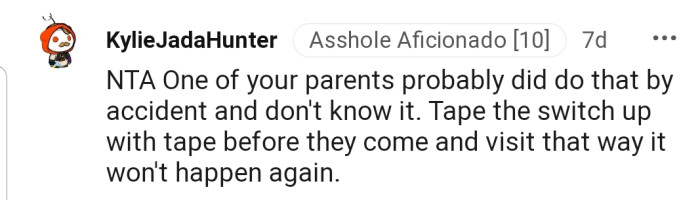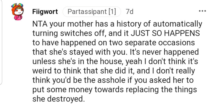 The commenters believe OP is NTA. Since OP explained in the post that their mother had a habit of turning off switches, they believe she must have done it without realizing she did.
