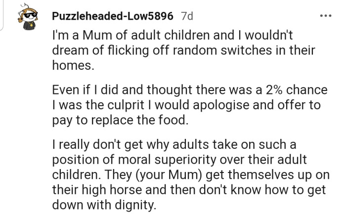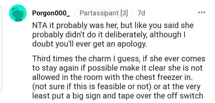 When it happened previously, OP had thought it was their fault but later found out it wasn’t. This time, they accused their mother of putting off the freezer, as she habitually switched off appliances around the house.