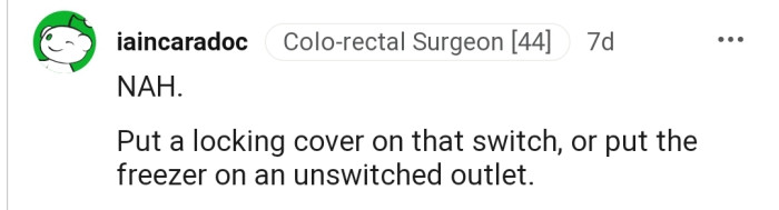 "Put a locking cover on that switch, or put the freezer on an unswitched outlet."