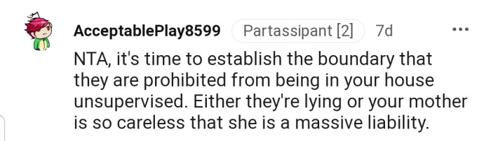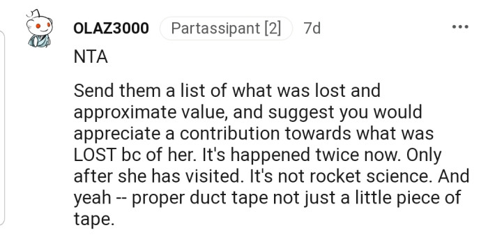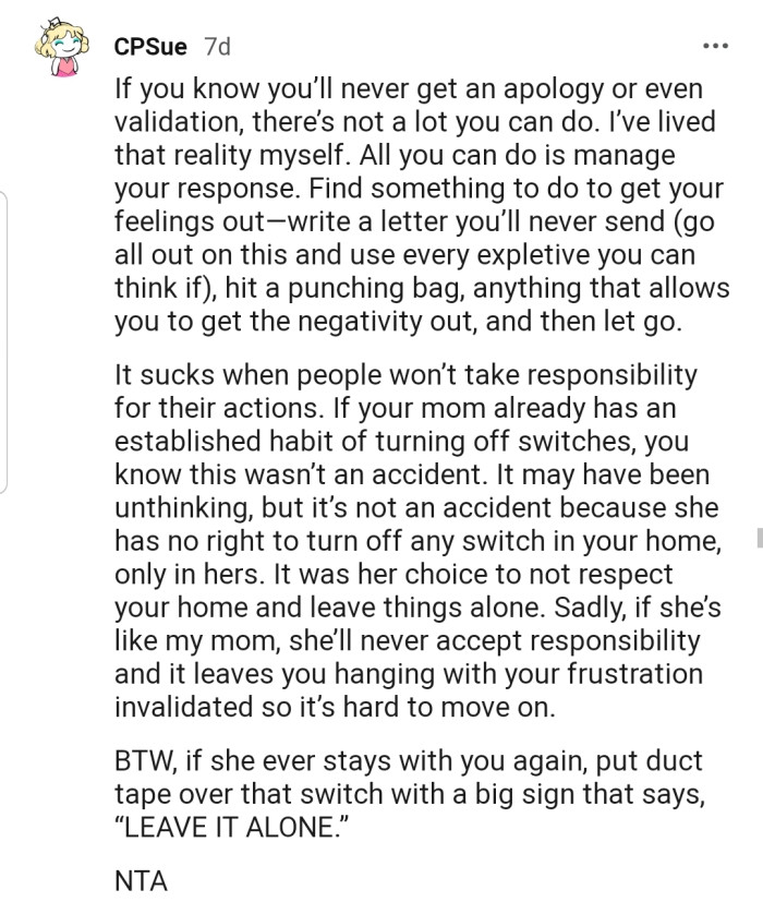 "It was her choice to not respect your home and leave things alone. Sadly, if she’s like my mom, she’ll never accept responsibility"