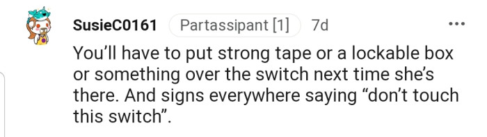 "You’ll have to put strong tape or a lockable box or something over the switch next time she’s there."
