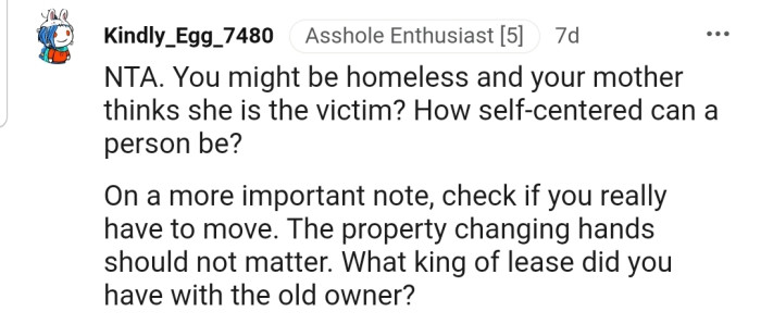 Reddit.comOP asked to move in with their mom after discovering that they could be homeless soon. But their mother exploded at them.