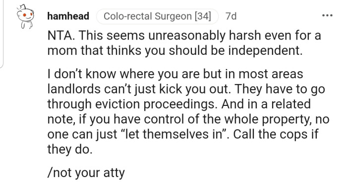 "This seems unreasonably harsh even for a mom that thinks you should be independent."