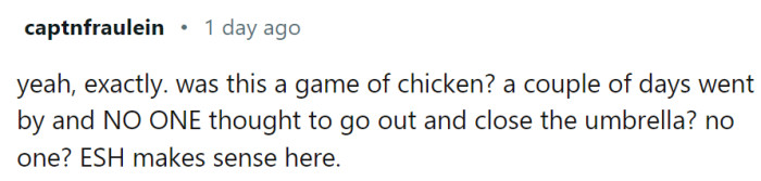 The table featured an umbrella that, although functional and decorative, came with a clear instruction: it had to be lowered and secured after every use, especially on windy days. Despite several reminders, OP's mother failed to heed this instruction.
