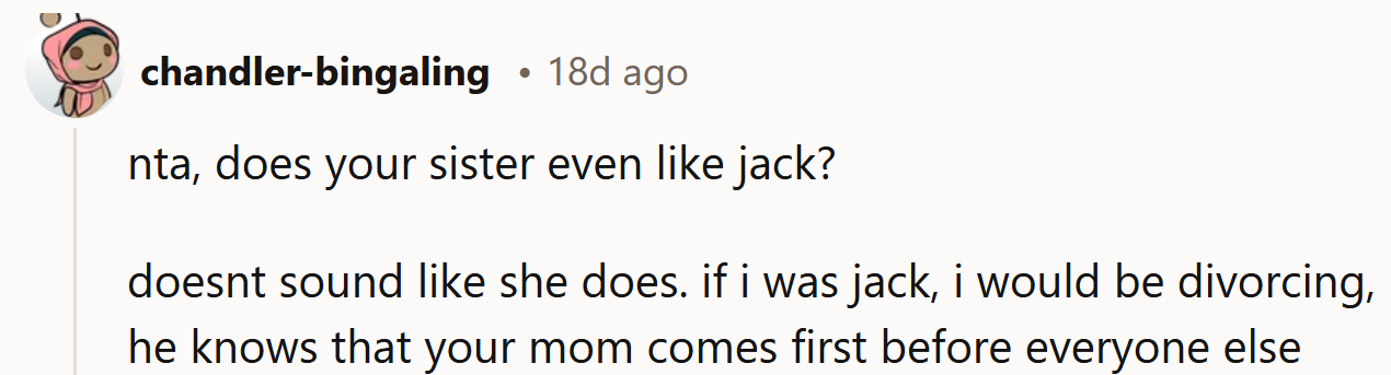 The OP says she laughed when her mother said that Jack probably just needed space.